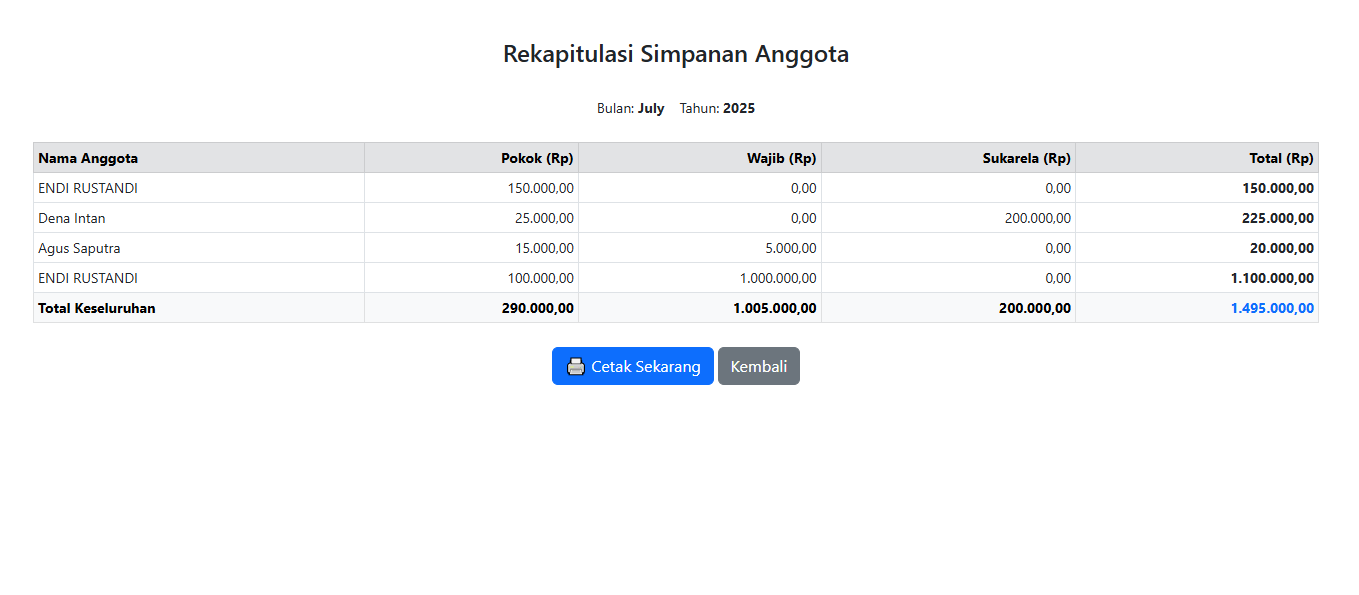 Hasilkan laporan dan rekapitulasi data anggota, simpanan, serta pinjaman dalam format PDF siap cetak.