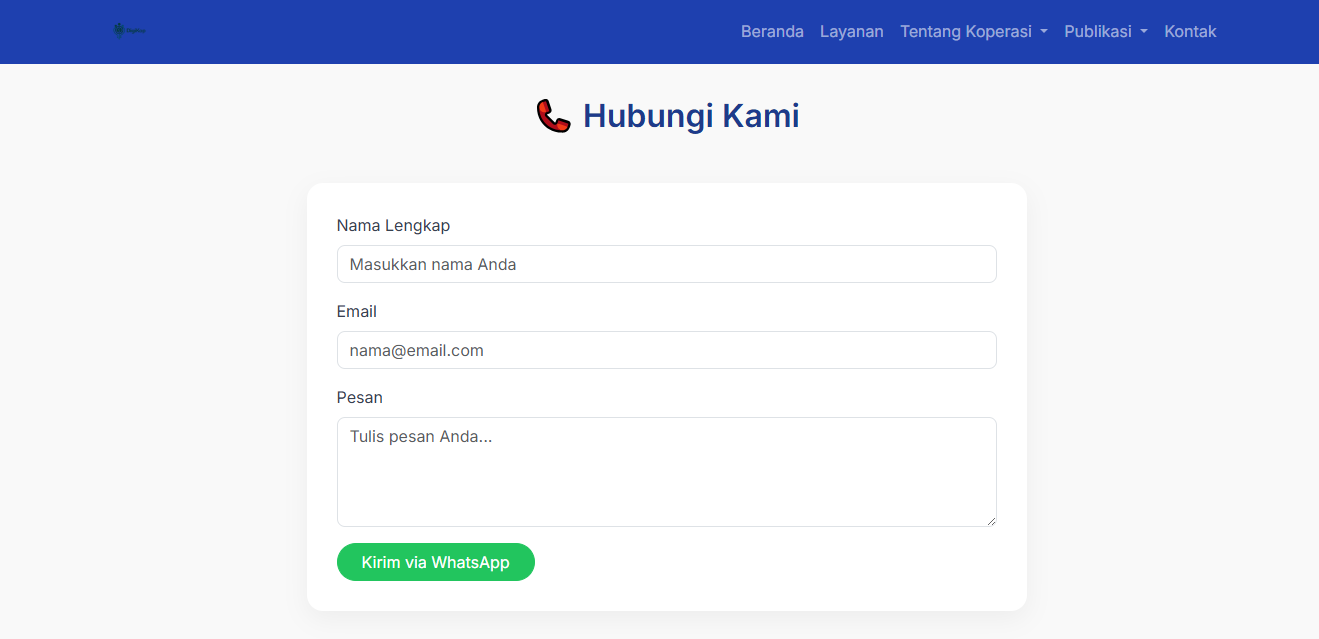 Form kontak langsung ke WhatsApp admin, memudahkan komunikasi dengan anggota tanpa harus pakai platform lain.